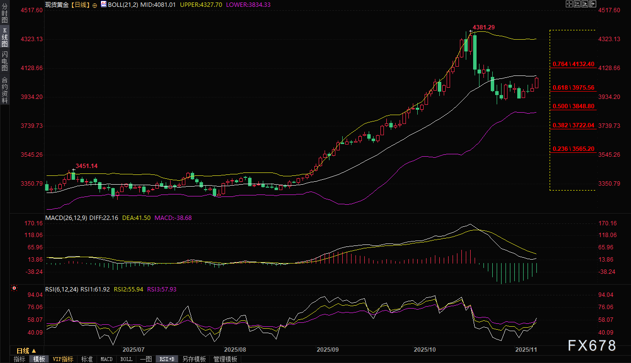 若持续站稳于10月22日高点4161美元上方,黄金可能指向4200美元心理关口。进一步向上,下一个阻力位为布林带上轨4325美元。